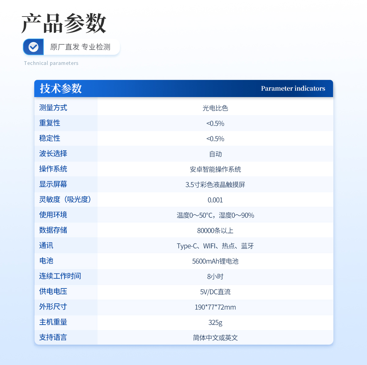 | 亞氯酸鹽:0.05~2.5mg/L; | 參考方法:碘量法原理 | 測量方式:光電比色 | 重復(fù)性:<0.5% | 穩(wěn)定性:<0.5% | 波長選擇:自動 | 操作系統(tǒng):安卓智能操作系統(tǒng) | 顯示屏幕:3.5寸彩色液晶觸摸屏 | 靈敏度(吸光度):0.001 | 使用環(huán)境:溫度0~50℃,濕度0~90% | 數(shù)據(jù)存儲:80000條以上 | 通訊:Type-C、WIFI、熱點、藍(lán)牙 | 電池:5600mAh鋰電池 | 連續(xù)工作時間:8小時 | 供電電壓:5V/DC直流 | 尺寸:190mm*77mm*72mm | 主機(jī)重量:325g | 支持語言:簡體中文或英文 |