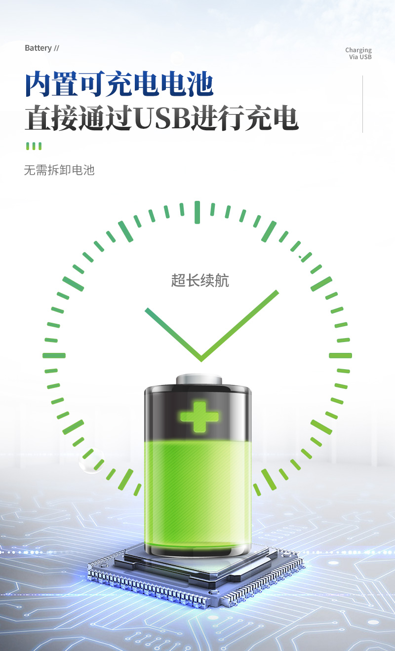 ? 內(nèi)置可充電電池,且直接通過USB進(jìn)行充電,無需拆卸電池;