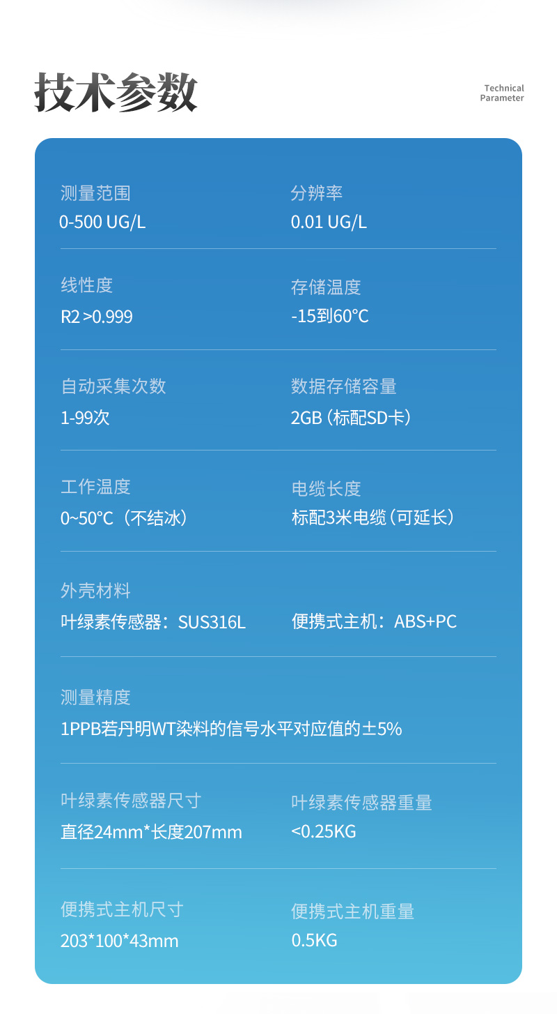外殼材料 | 葉綠素傳感器:SUS316L 便攜式主機(jī):ABS+PC |
