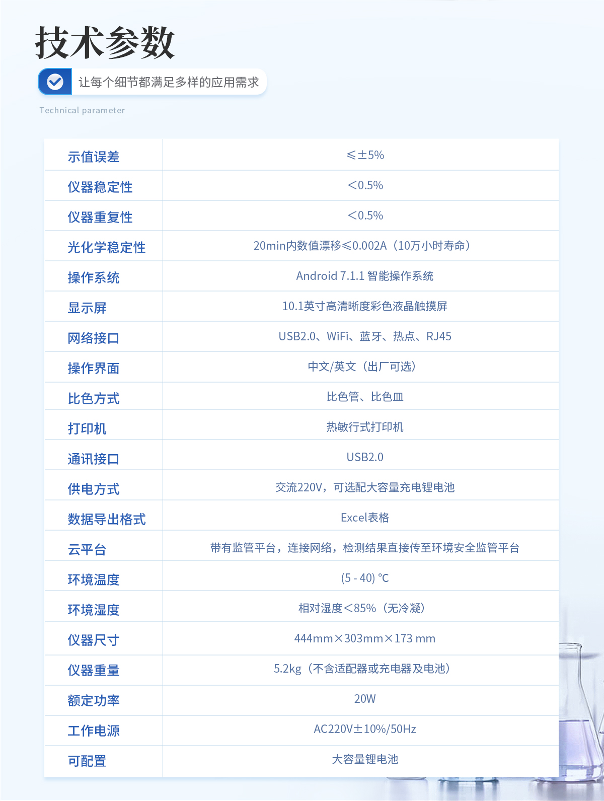 | 示值誤差:≤±5%; | 儀器穩(wěn)定性:<0.5%; | 儀器重復(fù)性:<0.5%; | 光化學(xué)穩(wěn)定性:20min內(nèi)數(shù)值漂移≤0.002A(10萬小時壽命); | 檢測量程:0.004-0.05mg/L; | 檢測下限:0.004mg/L; | 分辨率:0.001mg/L; | 比色方式:支持10mm、30mm、40mm、50mm皿比色和φ16mm管比色等比色方式 | 操作系統(tǒng):Android7.1.1智能操作系統(tǒng); | 操作界面:中文或英文操作界面; | 顯示屏:10.1英寸高清晰度彩色液晶觸摸屏; | 網(wǎng)絡(luò)接口:USB2.0、HDMI、WiFi、藍(lán)牙、熱點(diǎn)、RJ45; | 云平臺:儀器帶有監(jiān)管平臺,連接有線/無線網(wǎng)絡(luò),檢測結(jié)果直接傳輸至環(huán)境安全監(jiān)管平臺; | 打印機(jī):熱敏行式打印機(jī); | 數(shù)據(jù)儲存:800萬組,可自由調(diào)用查看; | 數(shù)據(jù)導(dǎo)出格式:Excel表格; | 儀器尺寸:367x243x125mm; | 儀器重量:5.3kg; | 環(huán)境溫度:(5-40)℃; | 環(huán)境濕度:相對濕度<85%(無冷凝); | 額定功率:10W; | 工作電源:AC220V±10%/50Hz; | 可配置:大容量鋰電池。 |