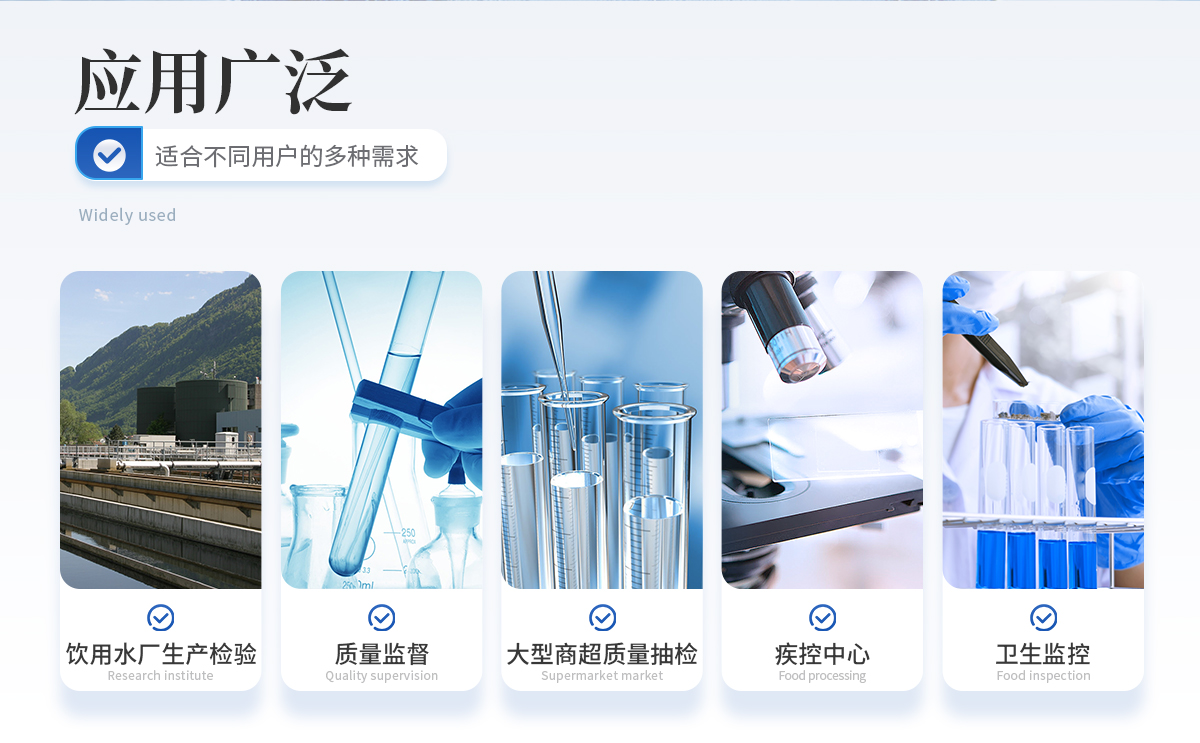 能夠廣泛的應(yīng)用于飲用水廠生產(chǎn)檢驗(yàn)、市場監(jiān)督部門質(zhì)量監(jiān)督、大型商超質(zhì)量抽檢、疾病控制中心、衛(wèi)生監(jiān)控等。