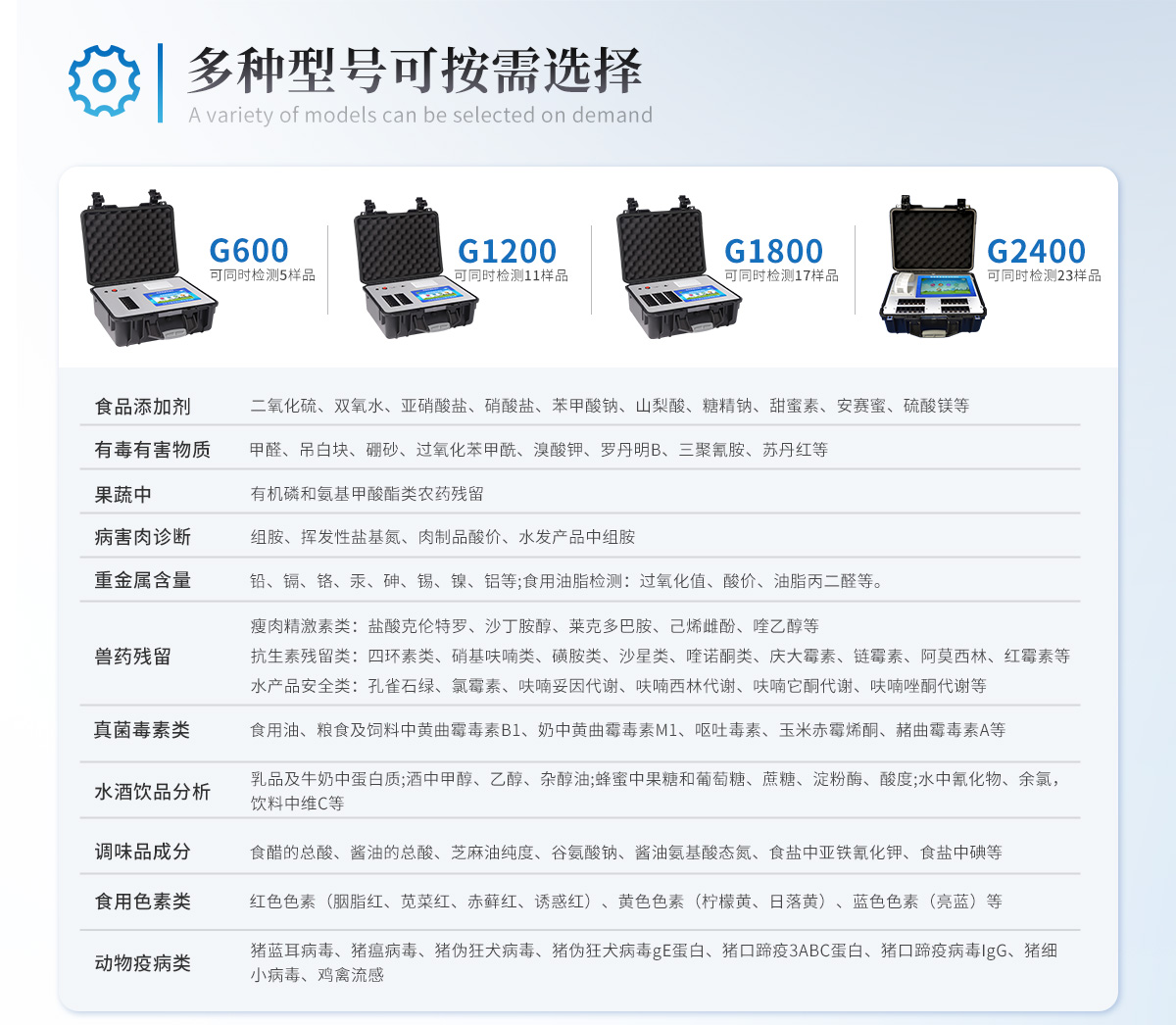 | 食品添加劑:二氧化硫、雙氧水、亞硝酸鹽、硝酸鹽、苯甲酸鈉、山梨酸、糖精鈉、甜蜜素、安賽蜜、硫酸鎂等 | 有毒有害物質(zhì):甲醛、吊白塊、硼砂、過氧化苯甲酰、溴酸鉀、羅丹明B、三聚氰胺、蘇丹紅等 | 果蔬中:有機(jī)磷和氨基甲酸酯類農(nóng)藥殘留; | 病害肉診斷:組胺、揮發(fā)性鹽基氮、肉制品酸價(jià)、水發(fā)產(chǎn)品中組胺 | 重金屬含量:鉛、鎘、鉻、汞、砷、錫、鎳、鋁等;食用油脂檢測:過氧化值、酸價(jià)、油脂丙二醛等。 | 瘦肉精激素類(獸藥):鹽酸克倫特羅、沙丁胺醇、萊克多巴胺、己烯雌酚、喹乙醇等 | 抗生素殘留類(獸藥):四環(huán)素類、硝基呋喃類、磺胺類、沙星類、喹諾酮類、慶大霉素、鏈霉素、阿莫西林、紅霉素等 | 水產(chǎn)品安全類:孔雀石綠、氯霉素、呋喃妥因代謝、呋喃西林代謝、呋喃它酮代謝、呋喃唑酮代謝等 | 真菌毒素類:食用油、糧食及飼料中黃曲霉毒素B1、奶中黃曲霉毒素M1、嘔吐毒素、玉米赤霉烯酮、赭曲霉毒素A等 | 水酒飲品分析:乳品及牛奶中蛋白質(zhì);酒中甲醇、乙醇、雜醇油;蜂蜜中果糖和葡萄糖、蔗糖、淀粉酶、酸度;水中氰化物、余氯,飲料中維C等 | 調(diào)味品成分:食醋的總酸、醬油的總酸、芝麻油純度、谷氨酸鈉、醬油氨基酸態(tài)氮、食鹽中亞鐵氰化鉀、食鹽中碘等 | 食用色素類:紅色色素(胭脂紅、莧菜紅、赤蘚紅、誘惑紅)、黃色色素(檸檬黃、日落黃)、藍(lán)色色素(亮藍(lán))等 | 動(dòng)物疫病類:豬藍(lán)耳病毒、豬瘟病毒、豬偽狂犬病毒、豬偽狂犬病毒gE蛋白、豬口蹄疫3ABC蛋白、豬口蹄疫病毒IgG、豬細(xì)小病毒、雞禽流感等 |