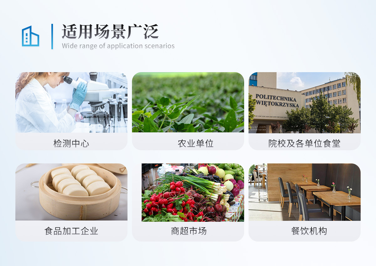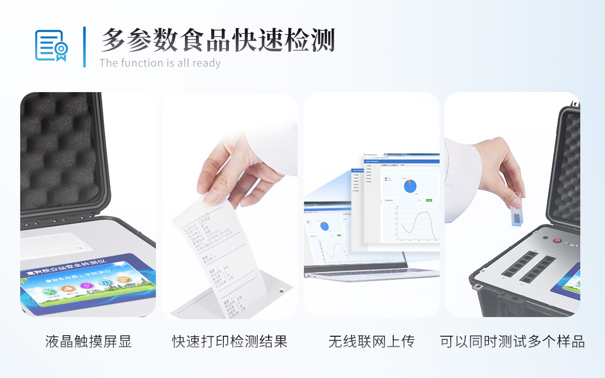 多功能食品安全檢測儀可快速檢測200多項(xiàng)目,包含非食用化學(xué)物質(zhì)、濫用食品添加劑、農(nóng)藥殘留、獸藥殘留、重金屬、病害肉、營養(yǎng)強(qiáng)化劑、抗生素類殘留、激素類殘留、真菌毒素類殘留、化學(xué)類殘留等現(xiàn)場的定性定量檢測。該多功能食品安全檢測儀為集成化食品安全快速檢測分析設(shè)備,廣泛應(yīng)用于市場監(jiān)管局、檢測中心、衛(wèi)生監(jiān)督部門、農(nóng)業(yè)部門、院校及各單位食堂、食品肉產(chǎn)品深加工企業(yè)、商超市場、司法部門、餐飲機(jī)構(gòu)、養(yǎng)殖場、屠宰場、檢驗(yàn)檢疫部門等單位使用。