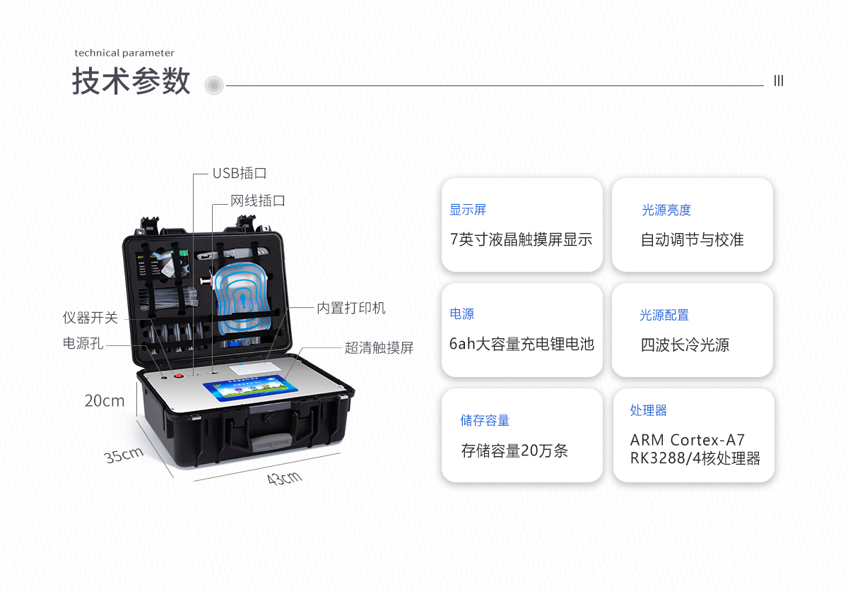 | 主控芯片采用ARM Cortex-A7,RK3288/4核處理器,主頻1.88Ghz,運轉(zhuǎn)速度更快速,穩(wěn)定性更強。 | 顯示方式:7英寸液晶觸摸屏顯示,人性化中文操作界面,讀數(shù)直觀、簡單。 | 交直流兩用,直流12V供電,可連接車載電源,可配6ah大容量充電鋰電池,方便戶外流動測試。 | 四波長冷光源,每個通道均配置410、520、590、630nm波長光源,標配**的光路切換裝置,專利光路切換功能可實現(xiàn)*多64波長,并且所有檢測項目可實現(xiàn)所有通道同時檢測。 | 光源亮度自動調(diào)節(jié)與校準 | 智能恒流穩(wěn)壓,光強自動校準,長時間連續(xù)工作光源無溫漂現(xiàn)象。 | 內(nèi)置新國家限量標準,與所測結果進行現(xiàn)場比對,并持續(xù)更新標準。 | 不間斷進樣,連續(xù)檢測 | 樣本編號自動累加。 | 數(shù)據(jù)無線上傳平臺,并可從平臺導出為Excel表格。 | 檢測結果存儲容量20萬條 | 同時支持U盤拷貝,標準USB接口,免驅(qū)動插拔。 | 檢測項目可擴充,固件可升級 | 儀器尺寸:43×35×20cm, 主機凈重:5.2kg |