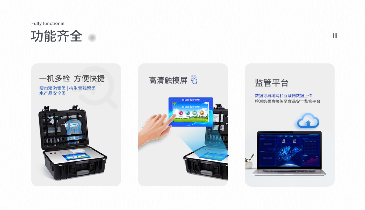 | 安卓智能操作系統(tǒng),采用更加**UI交互界面,儀器具有wifi聯(lián)網(wǎng)上傳、4G聯(lián)網(wǎng)傳輸、GPRS無線遠傳、網(wǎng)線連接功能,快速批量上傳數(shù)據(jù)。 | 智能化程度高,儀器具有自檢功能:具有開機自檢和調(diào)零功能,具有自動檢測重復性功能。 | 新一代高速熱敏打印機,檢測完成可自動打印檢測報告和二維碼。 | 儀器帶有監(jiān)管平臺,數(shù)據(jù)可局域網(wǎng)和互聯(lián)網(wǎng)數(shù)據(jù)上傳,檢測結果直接傳至食品安全監(jiān)管平臺。進行區(qū)域食品安全監(jiān)管及大數(shù)據(jù)分析處理與數(shù)據(jù)統(tǒng)計,檢測區(qū)域食品安全長短期動態(tài),達到食品安全問題預估、預警 | 一體化便攜式快檢設備,滿足現(xiàn)場及流動檢測使用需求,能夠在同一軟件下實現(xiàn)所有檢測項目的檢測,并可通過同一窗口直觀顯示檢測結果。 | 膠體金模塊檢測方式:軌道式自動傳輸掃描,檢測完成后自動退出檢測卡。 | 一體化主機,包含食品安全檢測模塊、多通道農(nóng)藥殘留檢測模塊、膠體金免疫層析檢測模塊。 | CT線自動識別,無需手動調(diào)整。 | 儀器具有品類多種類樣品菜單庫,可靈活選擇檢測樣品,不同的檢測通道可同時檢測不同的樣品項目。。 | 樣品處理簡單省力,整體操作快速、安全、便捷。 | 儀器具有自身保護功能,可設置用戶名及密碼,防止非工作人員操作等。 | 高靈敏度,高檢測精度,高重復性精度,掃描式高精度光學傳感器。 | 儀器具有重新校準、鎖定、恢復出廠設置功能。 | 內(nèi)置強大的數(shù)據(jù)庫,可在儀器上直接選擇樣品名稱、檢測指標、送檢單位等信息,也可在儀器上直接編輯錄入樣品名稱、檢測指標、送檢單位等信息并保存進樣品數(shù)據(jù)庫。 | 儀器具有重新校準、鎖定、恢復出廠設置功能。 | 結果判定線可修改,對照值標定值可保存,斷電不丟失數(shù)據(jù)。 | 兼容市場上所有的膠體金卡,使用耗材不受限制,極大增強用戶使用體驗。 |