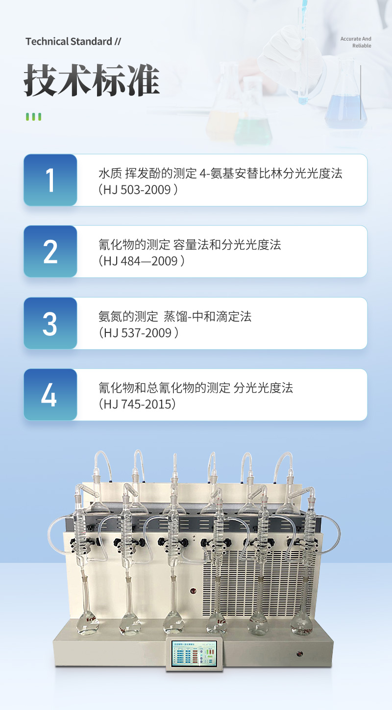 | 食品中二氧化硫殘留量、酒精度的蒸餾前處理項(xiàng)目 | 1.水質(zhì) 揮發(fā)酚的測(cè)定 4-氨基安替比林分光光度法(HJ 503-2009 ) | 2.水質(zhì) 青化物的測(cè)定 容量法和分光光度法(HJ 484—2009 ) | 3.水質(zhì) 氨氮的測(cè)定 蒸餾-中和滴定法(HJ 537-2009 ) | 4.土壤 青化物和總青化物的測(cè)定 分光光度法(HJ 745-2015) |