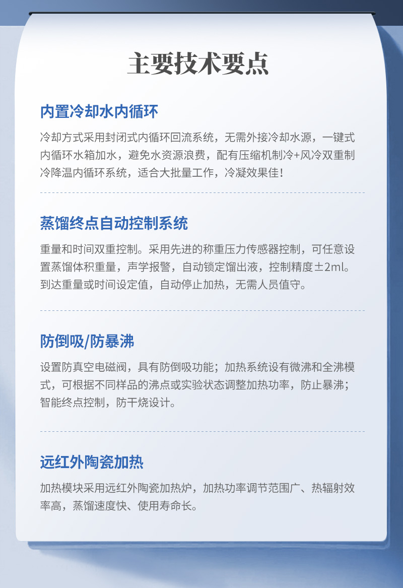 | 1、加熱方式:采用遠(yuǎn)紅外陶瓷加熱爐,紅外線輻射加熱(無(wú)明火加熱、防水); | 2、加熱單元:6個(gè),可單孔單控制; | 3、升溫時(shí)間:5-8min; | 4、蒸餾速度:2-12ml/min; | 5、蒸餾終點(diǎn)控制:自動(dòng)偵測(cè)蒸餾終點(diǎn)功能,采用稱重和時(shí)間雙重控制,蒸餾體積控制在±2ml之內(nèi),自動(dòng)化程度高; | 6、單爐加熱功率:0-450W(單孔可調(diào)); | 7、加熱功率:0-2700W(可調(diào)); | 8、冷卻方式:封閉式內(nèi)循環(huán)回流系統(tǒng),也可外接冷卻水源; | 9、防倒吸:設(shè)有防真空電磁閥,具有防倒吸功能; | 10、時(shí)間控制:0-200min可調(diào); | 11、蒸餾瓶規(guī)格:500mlX6,250 X6 更多規(guī)格可選; | 12、額定電壓/頻率:220V/50HZ; |