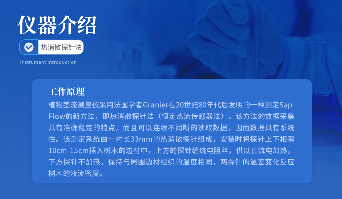 植物莖流測量儀采用法國學(xué)者Granier在20世紀(jì)80年代后發(fā)明的一種測定Sap Flow的新方法,即熱消散探針法(恒定熱流傳感器法)。該方法的數(shù)據(jù)采集具有準(zhǔn)確穩(wěn)定的特點(diǎn),而且可以連續(xù)不間斷的讀取數(shù)據(jù),因而數(shù)據(jù)具有系統(tǒng)性。該測定系統(tǒng)由一對長33mm的熱消散探針組成,安裝時將探針上下相隔10cm-15cm插入樹木的邊材中,上方的探針纏繞電阻絲,供以直流電加熱,下方探針不加熱,保持與周圍邊材組織的溫度相同,兩探針的溫差變化反應(yīng)樹木的液流密度。